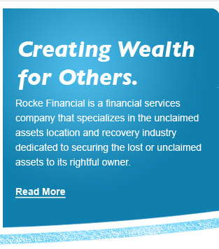 Rocke Financial LLC is the new leader in unclaimed assets location and recovery, serving businesses and individuals worldwide. Created to meet a very important need in the billion dollar unclaimed property industry, Rocke Financial represents clients from small businesses to large corporations, individuals, and estate heirs.